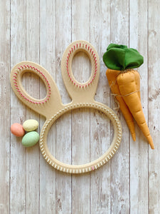 This cute Easter theme loom has the ability to make 2 size circles. The ear ovals are for women's socks or gloves (or preemie hats) and the face oval will make hats for teens or smaller women. It comes 3/8" gauge.