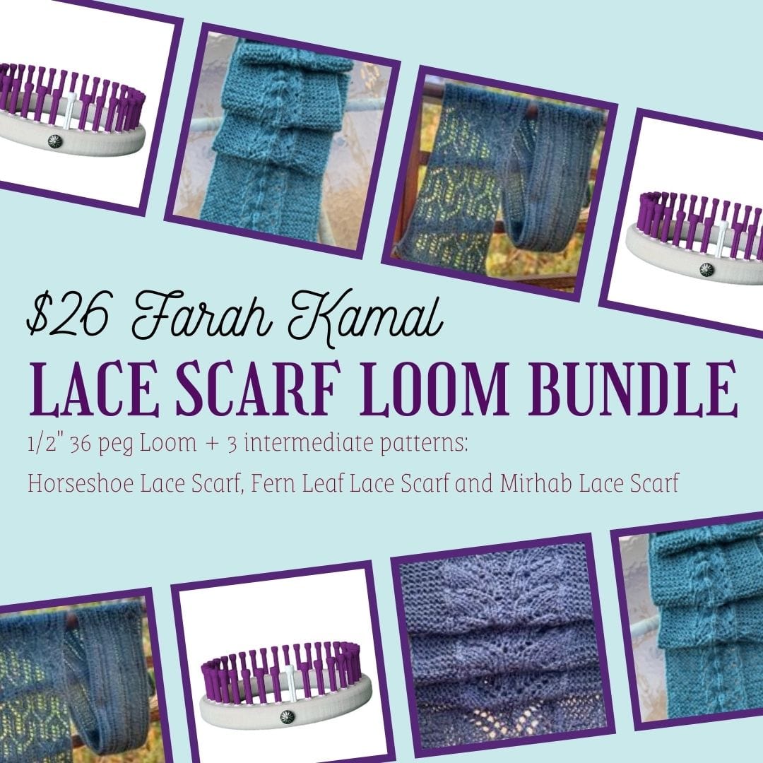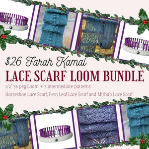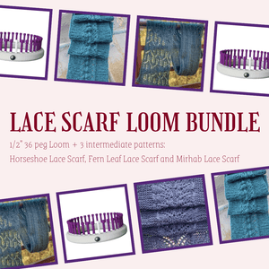 This bundle includes our 1/2" 36 peg round loom in purple pegs and 3 amazing lace scarf epatterns by Farah Kamal. Save on both the loom and the patterns when you buy them as a bundle.