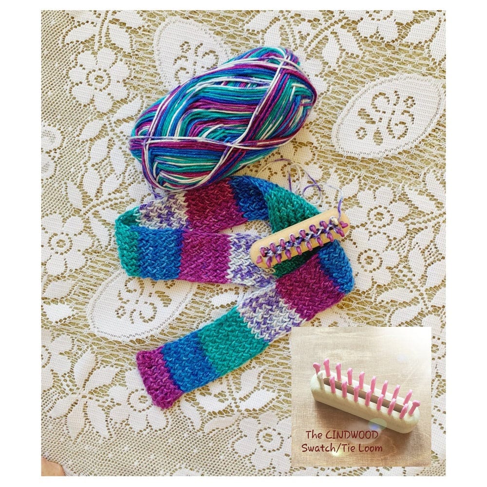 This adorable little loom was created as our ornament for 2018 with glitter and ribbon. After playing with it for a bit, we realized how useful this tiny little loom could be when learning new stitches and creating swatches. It can also be used for the perfect skinny tie!! (Cascade North Shore Prints self striping yarn used for Tie in photo - figure 8 stitch).