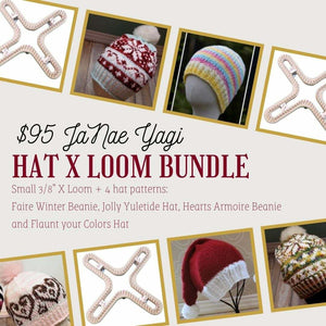 This great bundle includes 4 of JaNae Yagi's X loom hat epatterns as well as the small universal X loom in 3/8" gauge. Save when you bundle!