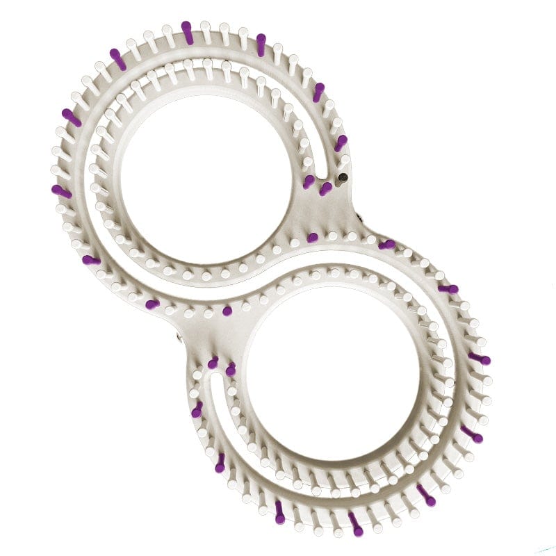 Our Universal S Loom can be used as a single or double rake afghan. Included is a movable wedge with a peg that is used in the inside groove of the loom so you can also knit round tubes in any size. Colored pegs aren't wrapped if using the figure 8 wrap on the double panel. 5/8 inch gauge has more space between each peg for easier wrapping. Universal Looms come with a knitting aid, and S-loom Wedge.