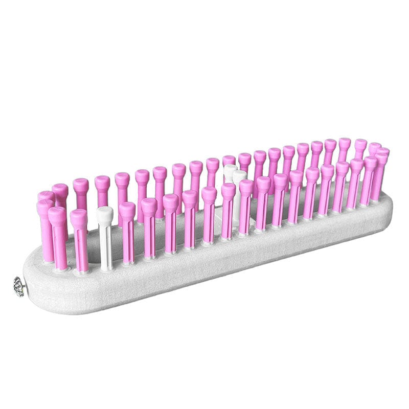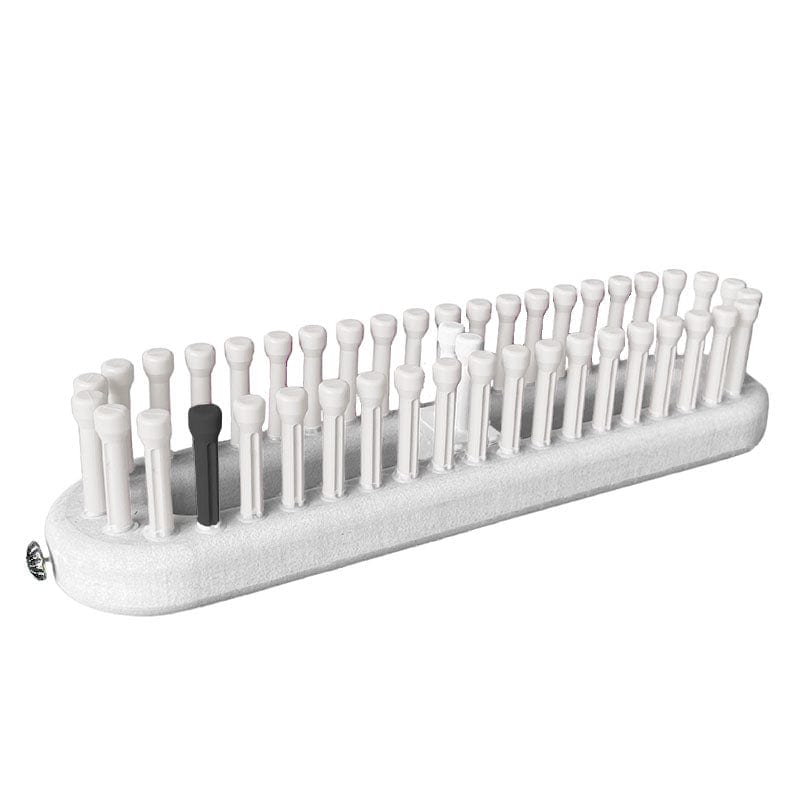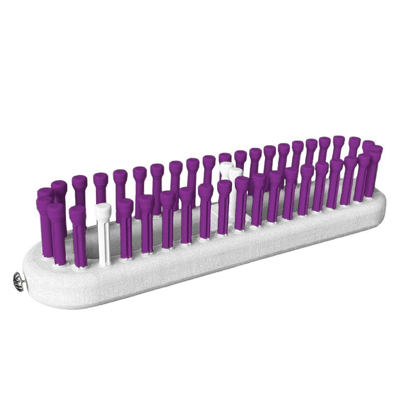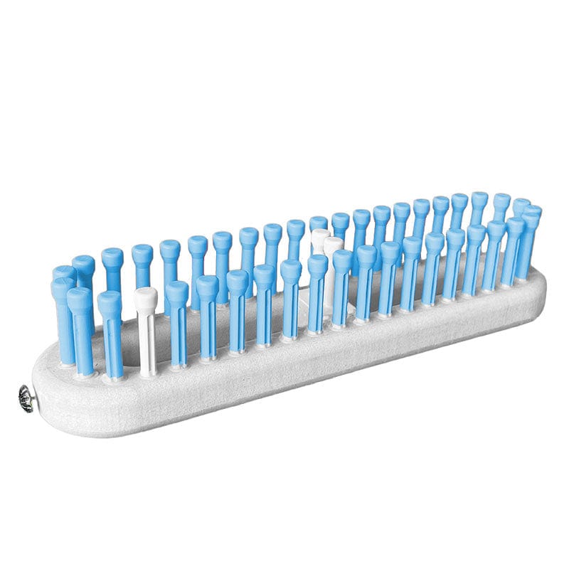 Make any size sock with #4 worsted weight yarn using our universal sock loom. This loom is 8" long and comes with a moveable wedge so you can create the correct amount of pegs needed for your perfect sock size.