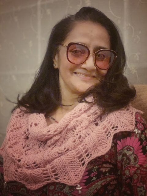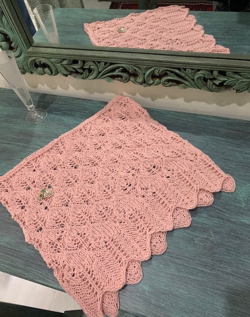 It's knitted in three-ply wool blend yarn, you can even use mohair, alpaca or any light finger weight yarn. Approximately 450 yards.