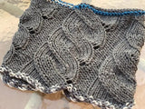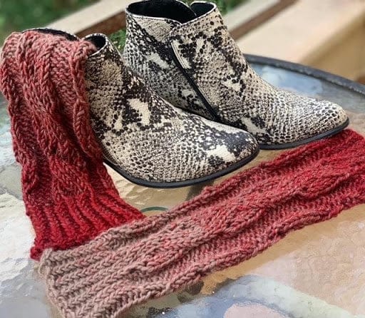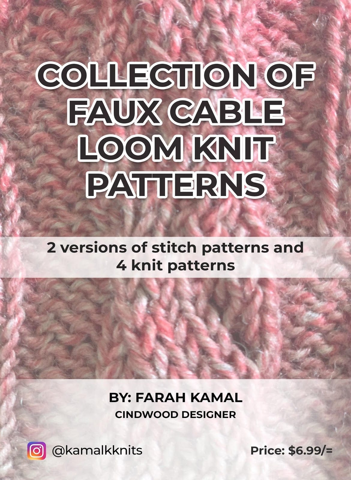 This booklet presents two versions of these winding, twisting highly textured, graceful faux cable stitch patterns, and full patterns for hat, cowl, leg warmer and scarf. All look gorgeous, and can be knitted on any ½” or 5/8” loom using corresponding weight of yarn.