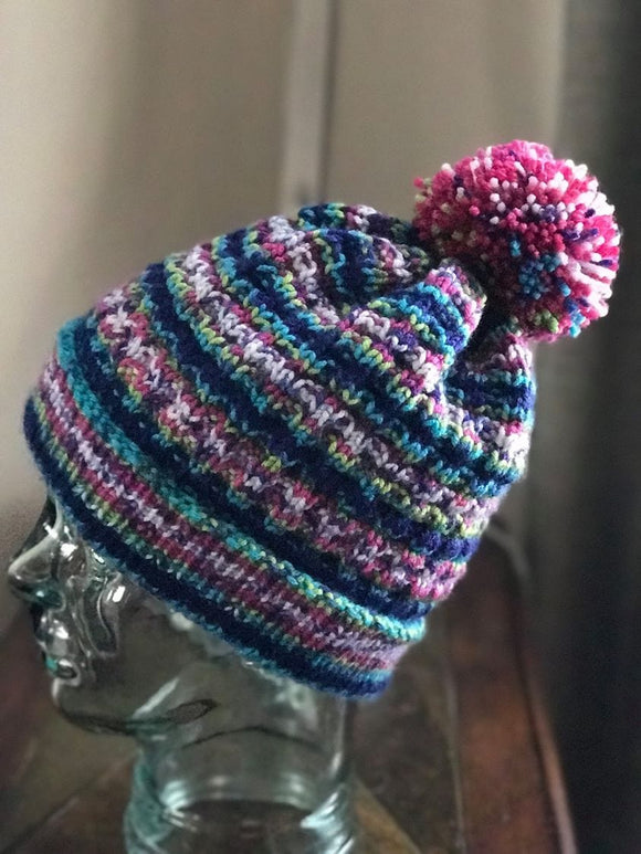 Available as a downloadable PDF All That Jazz Hat and Neck Warmer by Robbin Runtas was made on the 1/4 gauge 120 peg loom with two colors of #4 yarn for a warm, thick hat and coordinating neck warmer. Can be made on any loom with multiples of 4 but the designer prefers the 1/4 fine gauge for a great finished quality.