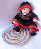 New pattern set by Scarlett Royal to go with the 3/8 gauge Adult Large 4 Piece combo set. Comes with 3 patterns to make the coordinated dress, hat, and booties. It is an intermediate pattern and uses broken seed stitch, open honeycomb, eyelets, decreasing, and rib stitch. Includes a video tutorial specifically for this pattern set illustrating the more complicated parts of the pattern. There are written and picture instructions as well. Designer used worsted yarn for this adorable head-to-toe project
