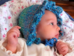 Beautiful baby in blues! This is beginner intermediate pattern by designer Scarlett Royal. It has a full video tutorial from beginning to end. It was done on the 36 peg 1/2" gauge loom and includes a formula on how to make is smaller or larger. This adorable pattern uses eyelet stitch, lace cast on, purl, knit, fine gauge draw string bind off.