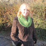 This adorable cowl can be made with either thick #6 yarn creating a stiffer fabric or #4 yarn creating a looser more elegant look.  Made on the