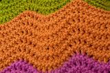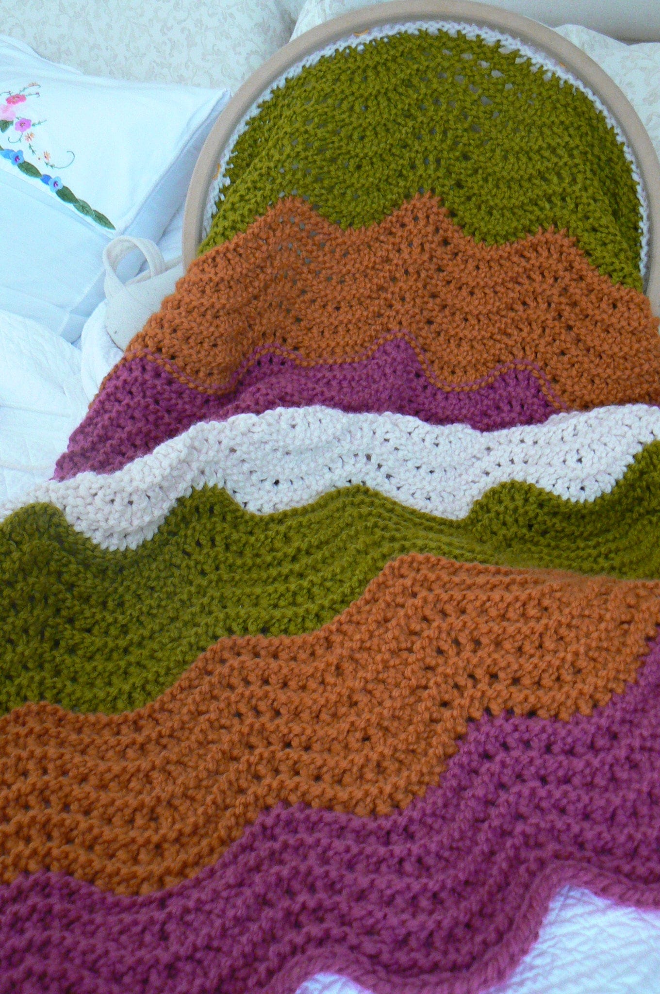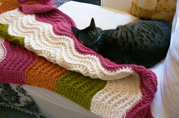 This is a loom knit afghan by Renee VanHoy in the Feather and Fan Stitch. It requires a 1/2 inch gauge loom with at least 118 pegs flat knit, and uses 9 skeins (about 990 yards super bulky yarn) of Lion Brand Wool-ease Thick and Quick yarn. A longer afghan may be made by adding additional skeins of yarn. The size as written is 40 inches wide by 55 inches long.