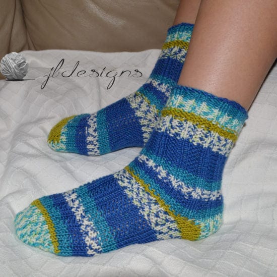 This intermediate level sock pattern by Joanna Brandt creates a beautiful sock featuring a garter rib stitch design.