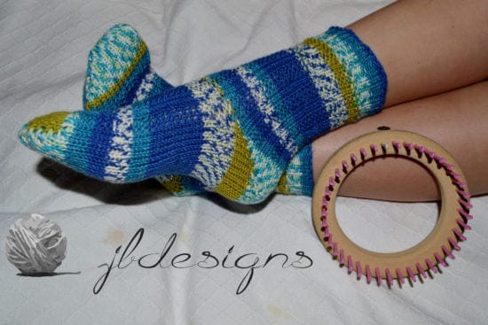 The pattern is worked in the round using the CinDWood 3/8" gauge Adult Sock Loom with 40 pegs. Other looms such as the knitting board sock loom 2 or the knitting board all in one loom could be used instead.