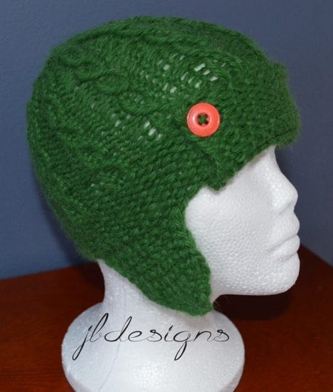 Stylish earflap hat by Joanna Brandt featuring 2 stitch cross cables and an aviator front flap. Detailed written pattern best suited for those that can ewrap, purl, and do simple increases by casting on extra pegs. Entire hat is created in one piece meaning no pieces to seam together! Pattern is written for the 44 peg 1/2” gauge CinDWood hat loom using approximately 70-85 yards of bulky #5 weight yarn. Finished hat size fits large baby to preschooler with a head circumference 17-19”. Video link included in pattern showing how to complete the simple 2 stitch cable cross which is a great way to learn how to do cables on your knitting loom.