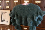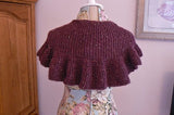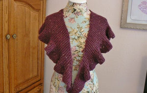Available as a downloadable PDF This small shawl by Renee VanHoy was inspired by one worn in the 2011 “Jane Eyre” film. Three sizes are offered. Jane, Jane's little sister, and Jane's Big Sister. All three are made on a 1/2 inch gauge knitting loom with at least (33/42/55) pegs. The pattern uses garter stitch and short rows to shape the soft ruffles and the shoulders of the shawl. The shaping lets the shawl sit nicely on the shoulders, without having to be held in place. The front panels are short enough to hang straight, or just long enough to tie or wrap. In a more modern interpretation, it will fit easily over a jacket and under the jacket color. The size across the back may also be increased or decreased (see note within the pattern), but the garter stitch construction has quite a lot of ease itself. Blocking is not necessary, but a matter of preference. DK yarn is recommended, but a light weight worsted yarn or even a bulky may also be used. A 5/8 inch gauge loom may be substituted as well. Ideal for 1/2" 60 peg adult regular gauge hat loom.
