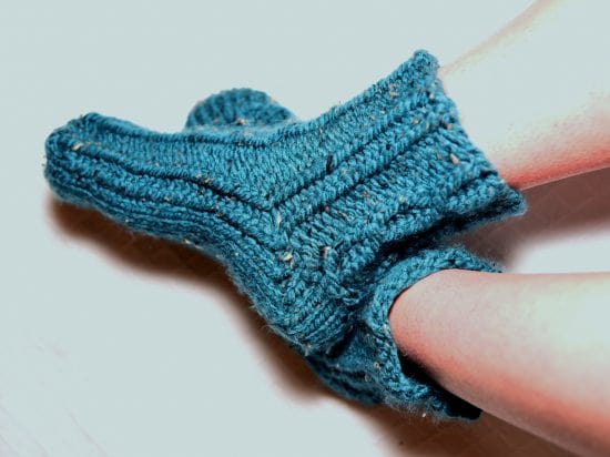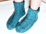 Made for my friend Jodi these comfy and stylish slipper socks feature a combination of rib and mock cable stitches and use german short row shaping for the heel and toe. I learned the basics of german short row shaping from project notes and photos done by Brenda Myers which she did based off a needle knit technique which you can view here http://www.ravelry.com/projects/domedweller/german-short-... Written pattern includes detailed row by row instructions for entire pattern as well as explanation of abbreviations/techniques used. A video link is provided to show how to do the mock cable (aka 2 stitch twist) Loom Required: 24 Peg 5/8” gauge Round loom (blue knifty knitter replacement loom) Yarn Required: 110-130 yards of bulky # 5 yarn. Sample done used 1 full skein and about 1/4 of another skein of Charisma Heather in Color Blue. Skill Level: Intermediate