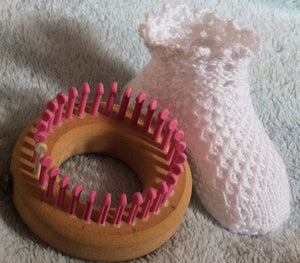 Available as a downloadable PDF This delicate "Laced with Hugs and Kisses" pattern is perfect for a baby's first sock (epattern only - loom sold separately). Created by Scarlett Royal, it used a 1/4" 30 peg loom and has lacing as well as other techniques for creating the honeycomb brioche stitch. It includes video footage for the complex parts of this advanced intermediate pattern.