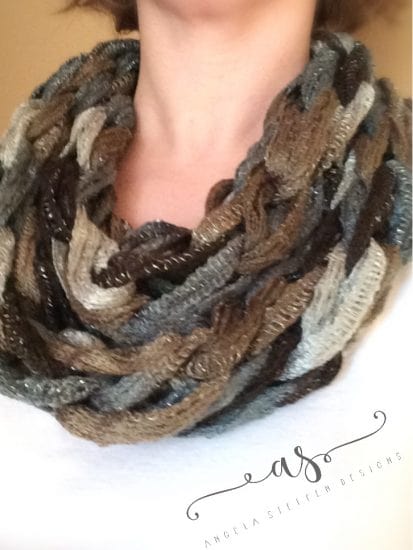 This scarf by Angela Steffen is named by the way it Mimics the look of arm knitting---done on the loom! Uses the 24 peg loom in 5/8" peg spacing (also called the blue KK Replacement loom). The trick with this pattern is to cast on more than one peg at a time, while utilizing a simple e-wrap. Uses one skein of Sashay, Pirouette, or other ruffle yarn.