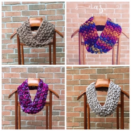Suggested yarns are Bernat Mega Bulky, Red Heart Grande, or a ruffle type yarn. These are very bulky 6 yarns.