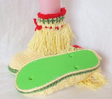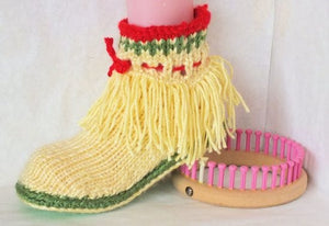 Available as a downloadable PDF Scarlett Royal's snuggly "Red Tulip Moccasins" used 36 peg 1/2" gauge loom for the project. Written for size 7-8 flip flop bottoms. It is an intermediate pattern and uses kitchener cast on, reverse gusset, knits, purls, decreases, yarn overs, and color changes. Some basic crochet is possibly needed for the strip that is glued around the sole of the flip flop, but substitutes can be used such as I-cords or rope.