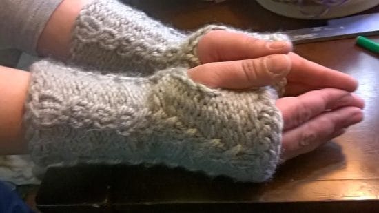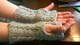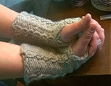 Available as a downloadable PDF Comfy, cute and cozy fingerless glove pattern by Joanna Brandt to keep you warm! Made with a bulky yarn for extra warmth that works up quickly. Pattern includes detailed written instructions and video links made just for this pattern to help with techniques. These fingerless gloves feature a mix of knit, purl and cable twist stitches and is worked entirely in the round on a 20 peg 5/8” gauge loom (CinDWood Child Slipper Loom or universal hat/scarf loom set up for 20 pegs in the round). Pattern written for small to medium glove size (7.5-9 inch hand circumference) and requires peg multiples of 5. Requires roughly 60-80 yards bulky #5 yarn, sample done using a little over 1/2 a skein of charisma yarn. *Two different pdf versions are given- the original is in grey, and the revisited version is in taupe.*