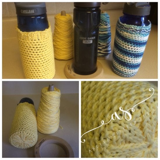 This water bottle cover is great for absorbing condensation, thus cotton yarn is preferred. Uses less than 1 skein of a worsted weight cotton yarn (I Love This Cotton, Lily Sugar ‘n Cream, etc). Uses loom with 3/8” spacing and 36 pegs. (Sample made with CinDWood Small Adult Glove Loom) Uses Uknit, Purl, and Figure 8 stitches. Video links provided for figure 8 and cast off (not my videos). note: make sure your bottle fits inside the loom without much wiggle room; if it doesn’t fit, your cover will not fit and you will need to adjust to a smaller or larger loom with 3/8” peg spacing