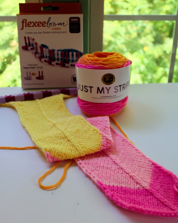 This fun scarf by Scarlett Royal was made on the KB flexee skinny peg loom. It is a pretty simple pattern that includes a video tutorial on making the stitch pattern.
