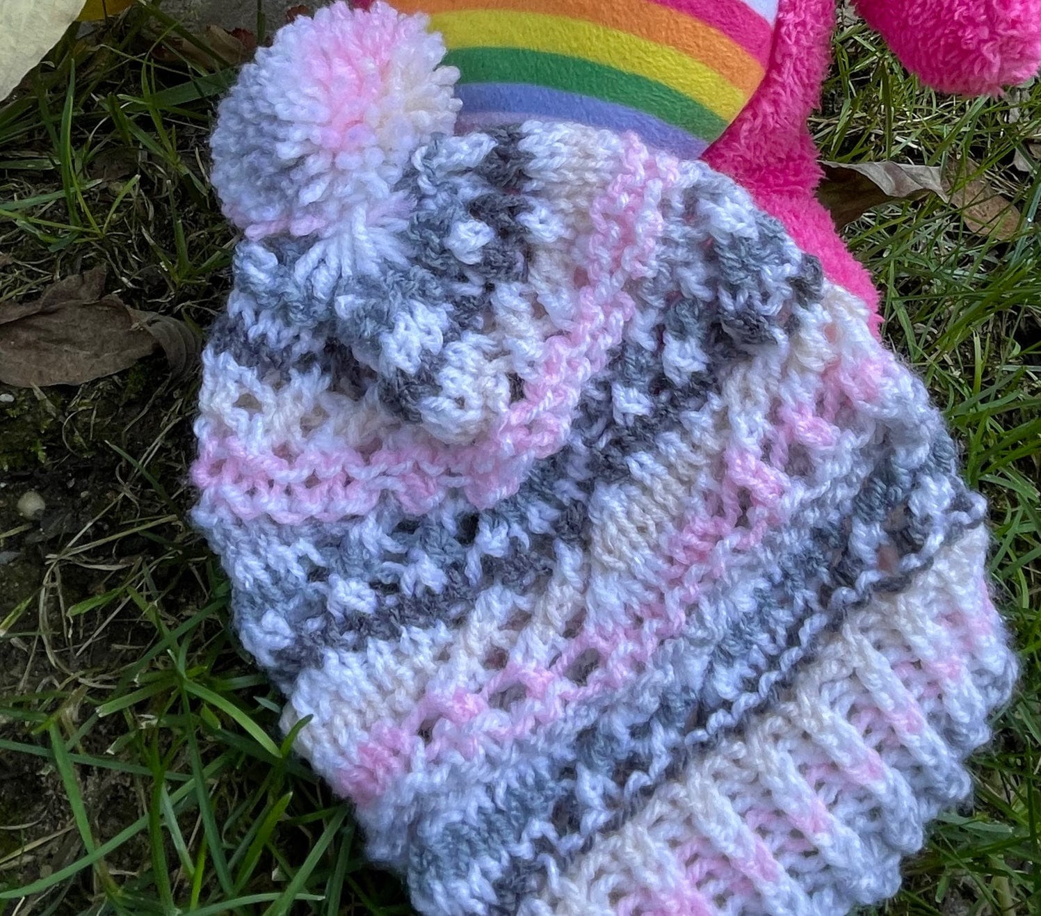 This adorable lacey hat by Farah Kamal was made in 7/16" gauge using the Universal Hat/Scarf Loom. This hats chart uses 40 pegs which is perfect for a child hat but can be upscaled in pegs of 10. Use 60 or 70 for an Adult Small or Adult Large Hat.