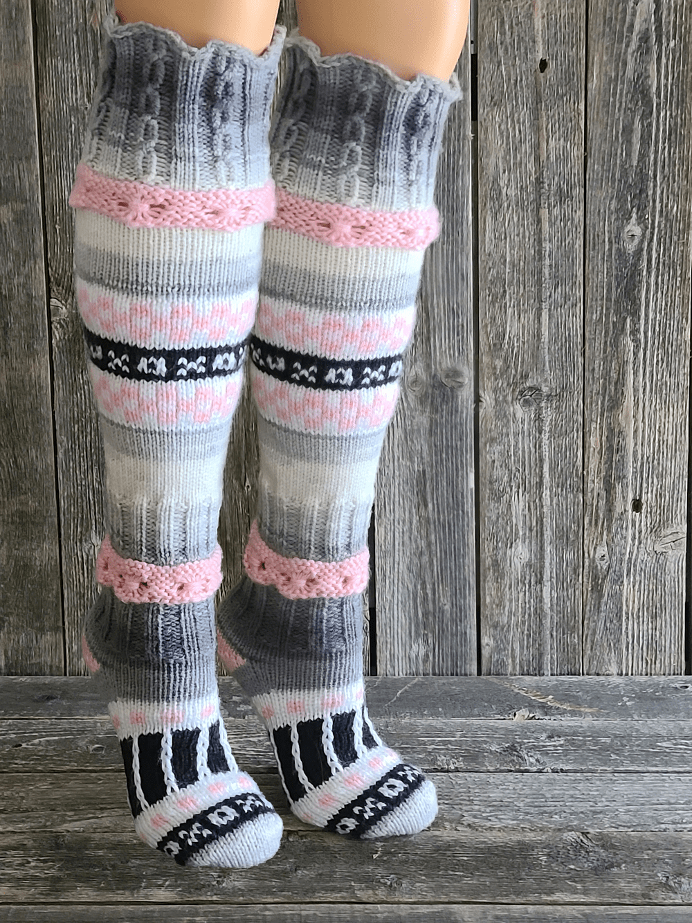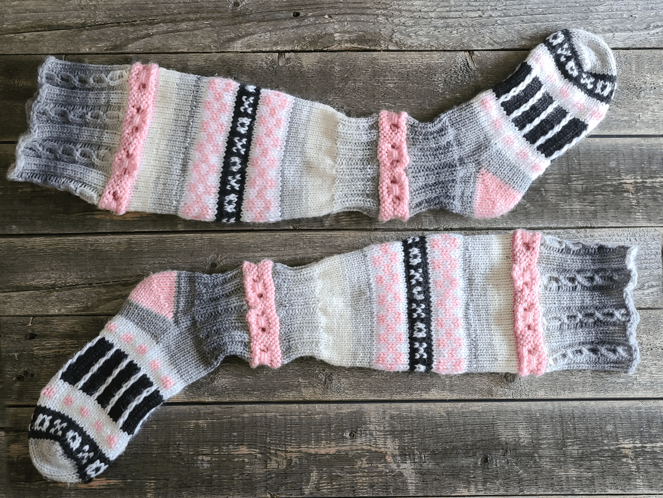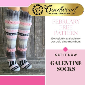 The Galentine’s Socks are worked in the round from the top down. “Average” size will fit most teens and adult women. Heel and toe are worked with German short rows but may be worked in any method you prefer.