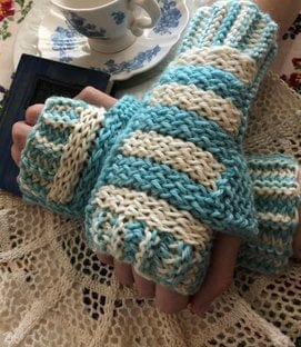 Tigger Mitts have broad horizontal stripes bordered by narrower vertical stripes. Don't be fooled - these are a fun take on Mosaic colorwork, so you only work with one color in a row!