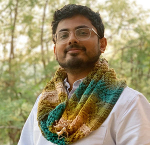 This chunky and lacey cozy cowl is knitted combining two different patters using yarn shaded in vivid peacock feather colors. The two patterns, leafy zigzag and zigzag mesh are nature- inspired patterns that can be used separately or combined together in shawls, stoles, cowls, blankets and hats. The final product is a textured lace fabric.