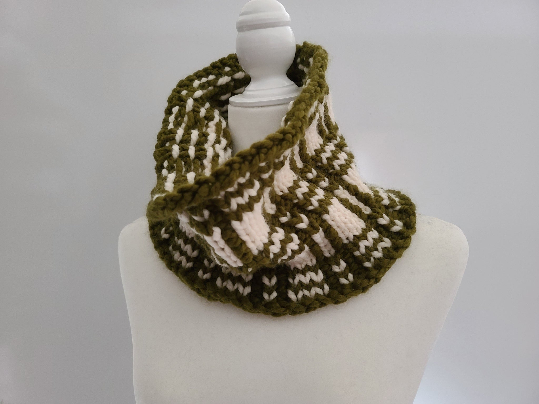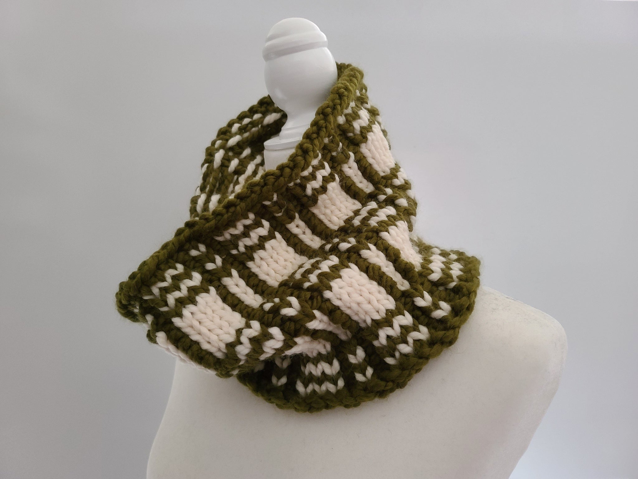 The Plaid Cowl is knit in the round on a 3/4" XLG loom with 60 pegs (3/4" 60 pegs Small Round Afghan Loom). It’s incredibly warm and features a festive plaid motif. Both a graph and the written instructions are included.