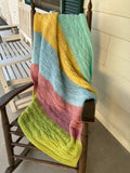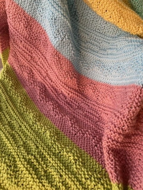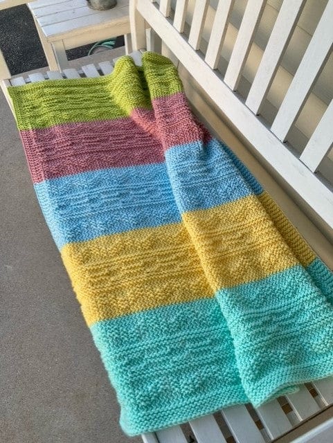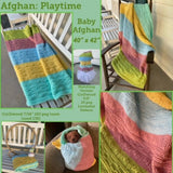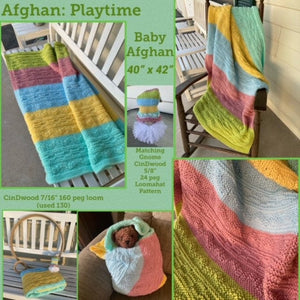 This beautiful baby blanket by Laurie Schue was made on our 7/16" 160 peg loom XL Round afghan loom (Using 130 pegs). Our smaller 20" 140 peg Large round afghan loom will also work for this project. the completed size is 40"x42" and it is using worsted weight #4 yarn.