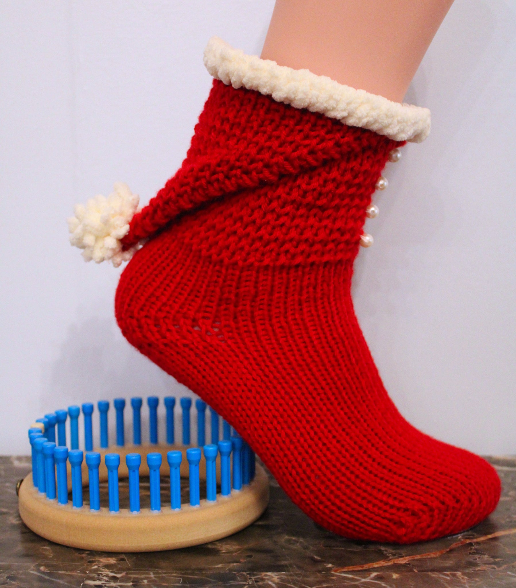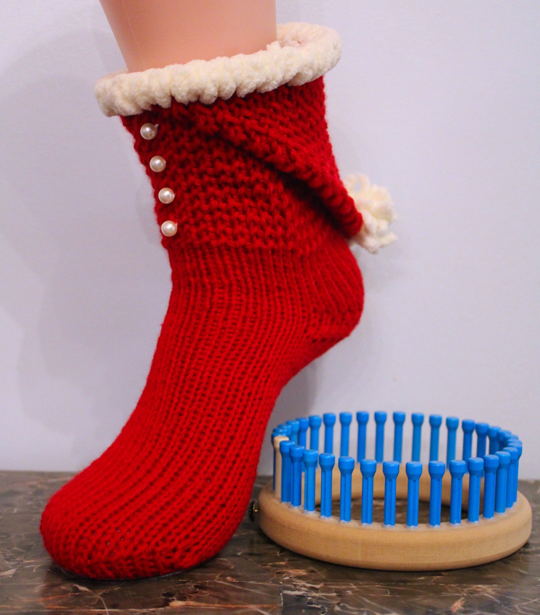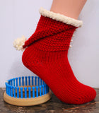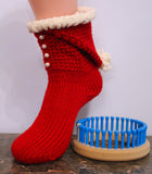 "Santa Hat Booties" done on the 36 peg 7/16" gauge loom but could be done in the 1/2" gauge as well. The pattern uses worsted weight yarn for the bulk of it and a fluffy blanket yarn for the top. It is an intermediate pattern because it uses a kiss heel, double wedge toe with a Kitchener close, plus the cuff to do the hat is all one piece so there is adding rows and cast on stitches back to the pegs to close and finish everything off. You need about 6 to 8 buttons for the cuff.