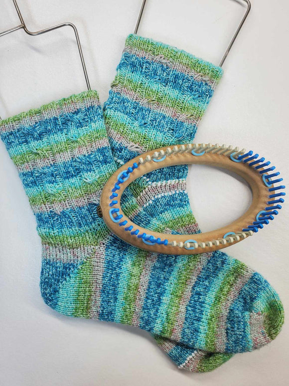 These fabulous socks made by designer Amanda Pratt on our Oval customized 1/4" 60 peg looms are a great gift for the men in your life.