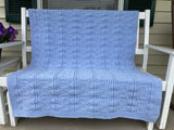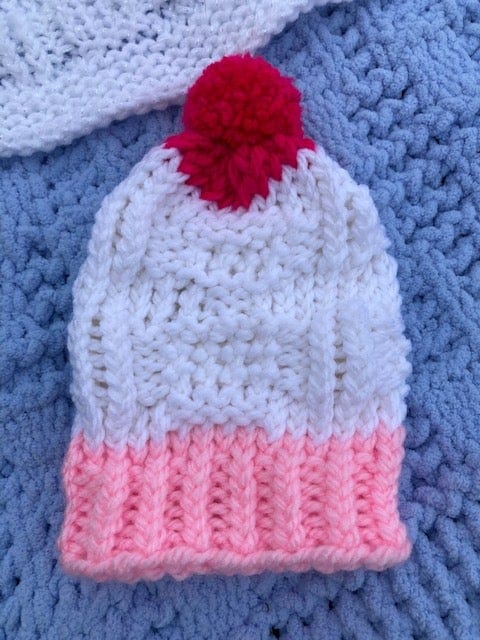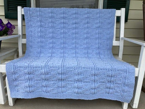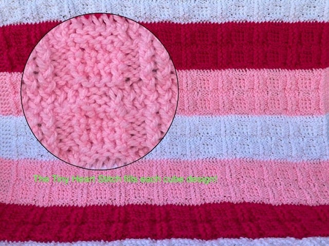 This beautiful new pattern by Laurie Schue, is a combination of cubes filled with the Tiny Heart stitch. (Filled with Love!) This is 1 design but includes instructions for 5 different projects. 2 Baby Blankets, 1 Baby Hat, 1 Toddler blanket and 1 Adult or Toddler throw blanket.