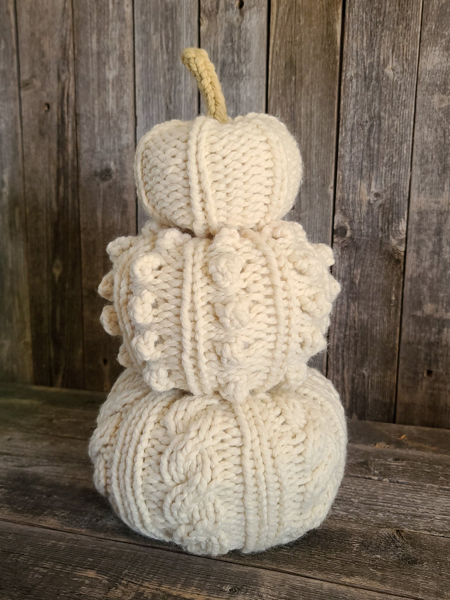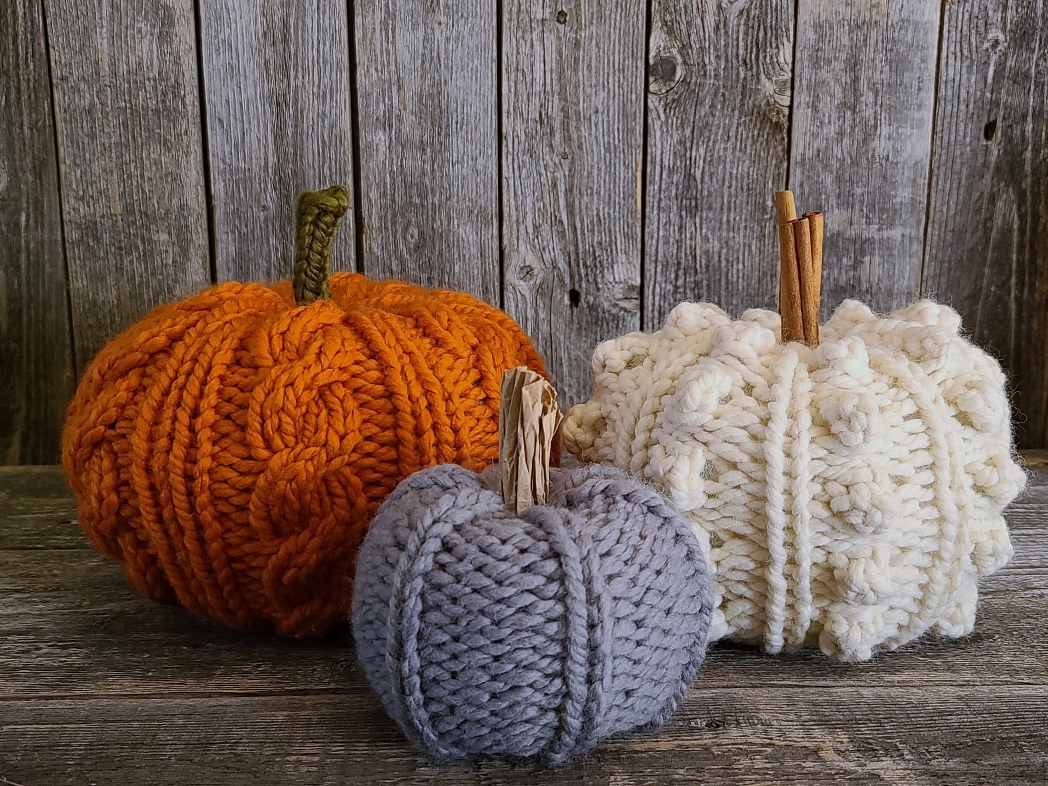 The Textured Pumpkin Stack is made of 3 pumpkins in a mix of fun textures. The pumpkins are worked in the round from the bottom up. You will need poly-fill or your favorite stuffing and your choice of stem. Make all three in matching yarn or choose 3 coordinating colors. Enjoy stacking your pumpkins or display them separately. A chart and written instructions are included. Knit on your favorite XLG 3/4" or LG 5/8" Loom: simple pumpkin 24 pegs, bobble pumpkin 32 pegs, cable pumpkin 48 pegs, stem 3 pegs.