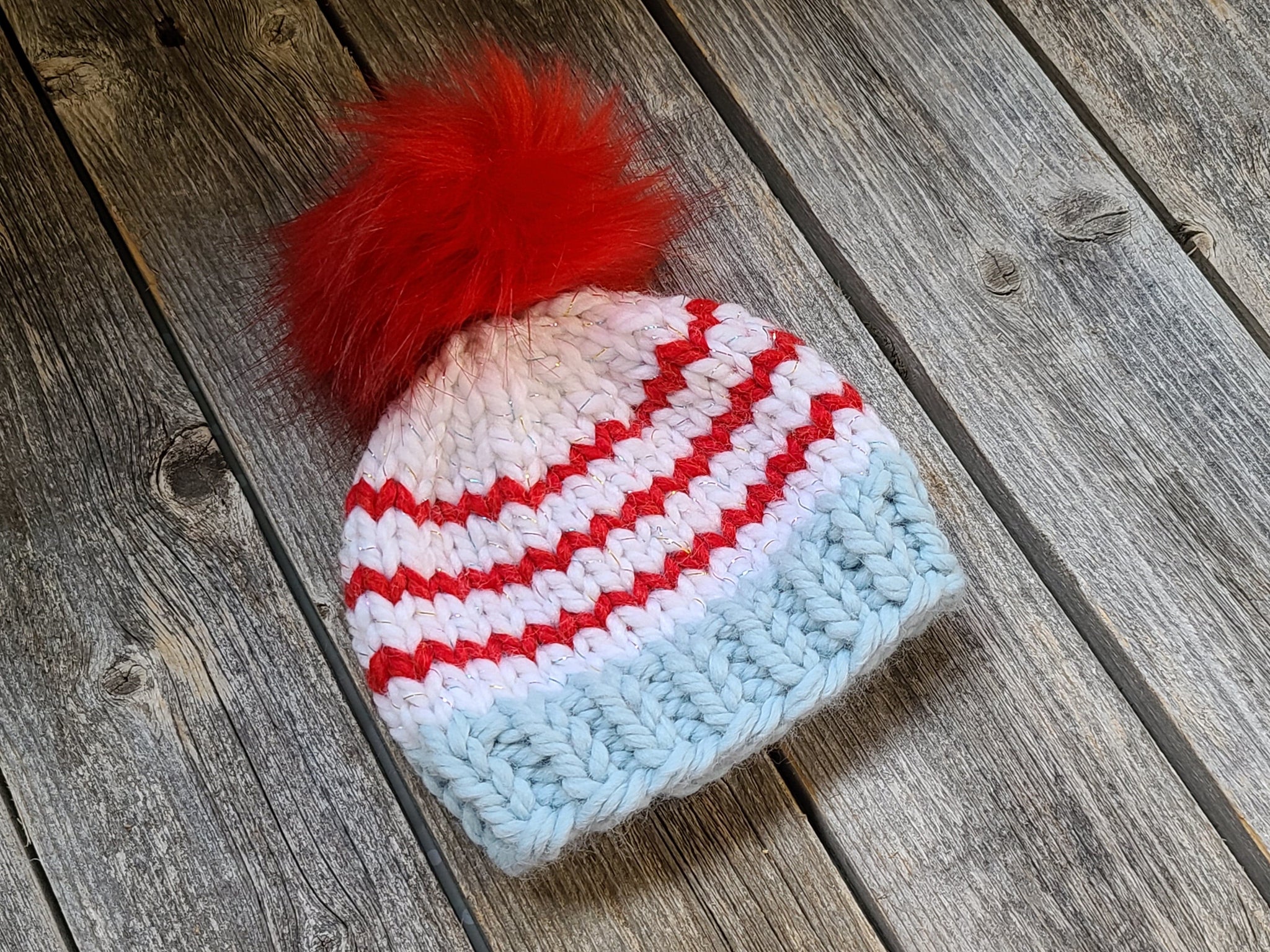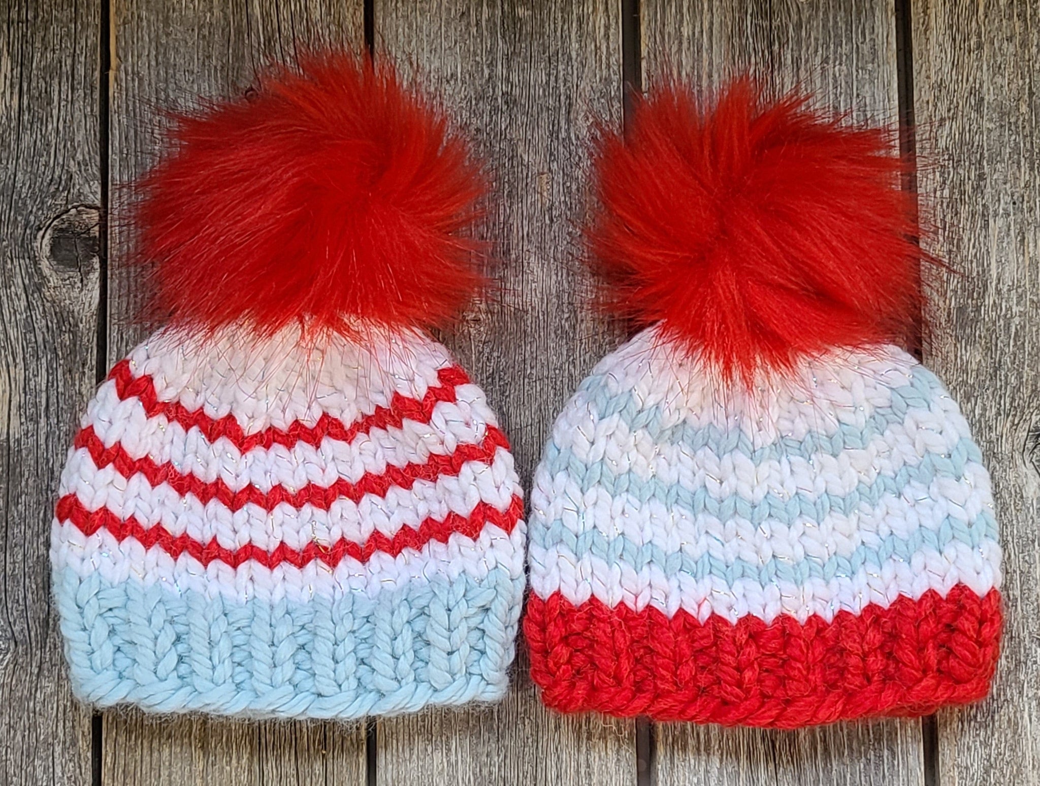 The Striped Baby Beanie is worked in the round from the brim up. This pattern uses 2-3 colors to create an easy contrasting striped beanie. The knit stitches used in this pattern are the “u”, “true” or “flat” method. If the “ewrap” is substituted the hat may look slightly different and stitch count and rows will need to be adjusted. Knit the size you need on an XL gauge loom: newborn 24 pegs, 3-6 months 28 pegs, 6–12 months 32 pegs.