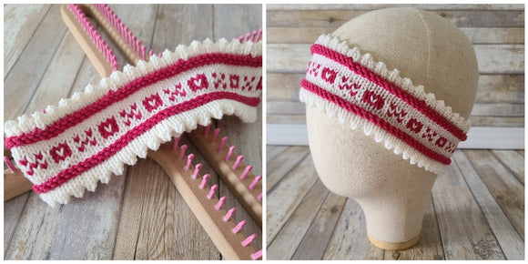 The XoXo Headband is worked in the round. It features scalloped edges and a stranded knit “xoxo” motif. Fits “average US womens” S-L sizes.