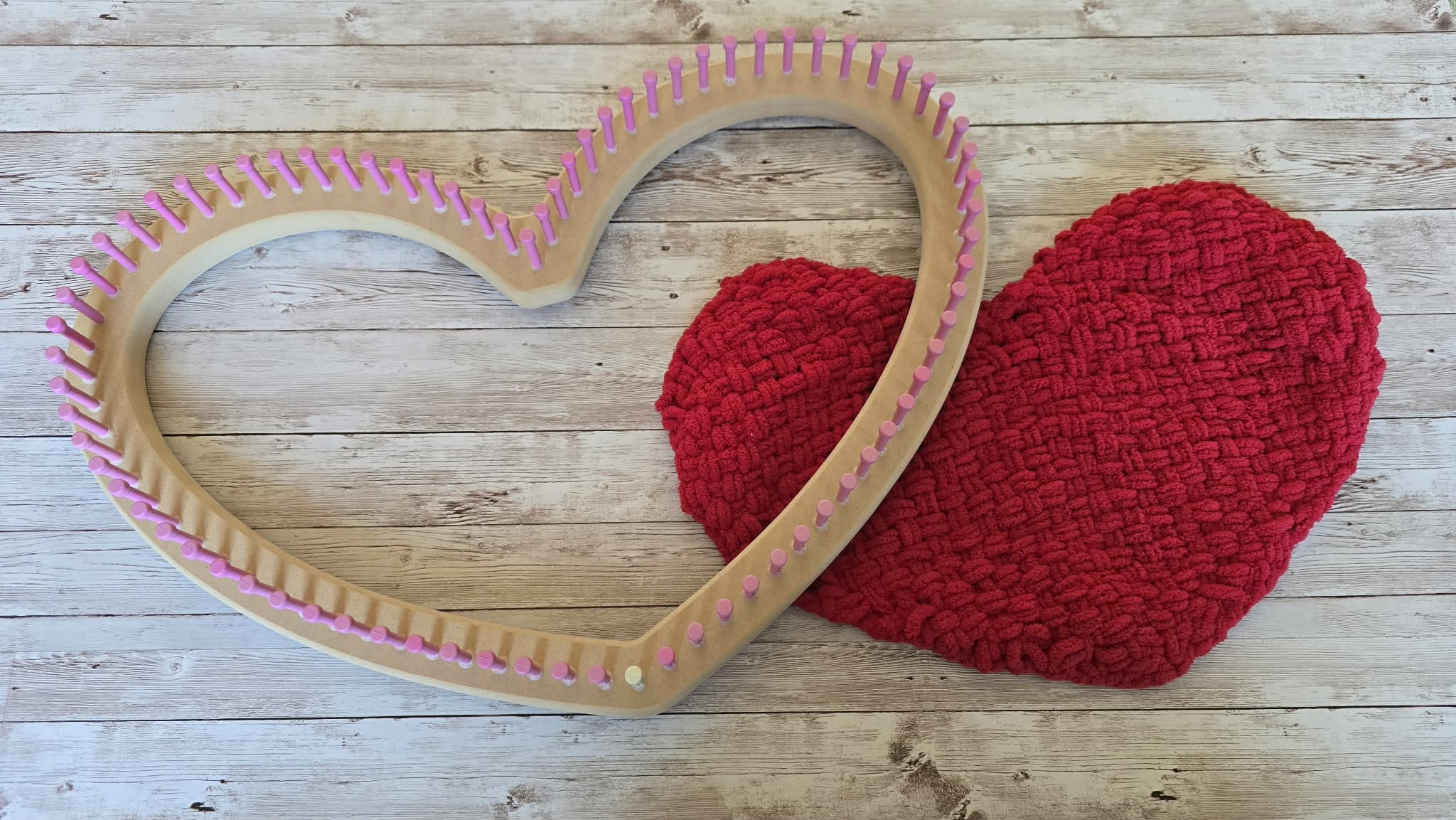 This fun holiday Afghan loom in the shape of a heart can be used to create flat panels, a cowl, or even weave a heart. Such a fun addition to your loom collection. Available in Pink, Red or Tan Pegs. The heart piece weaved in the photo is 15" across and made with Bernat blanket yarn. the loom is slightly larger than the small round afghan loom, so can make baby blankets if knitted on.