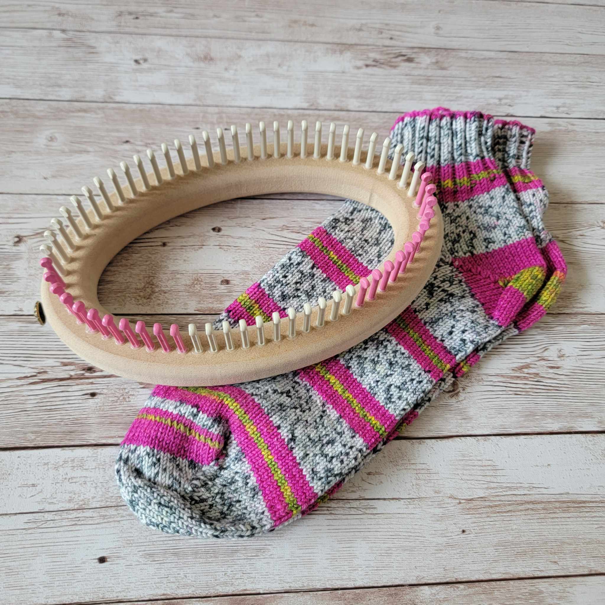 Thank you to our designer Laurie Schue and her idea to create these oval looms with marked pegs for wraps and turns. An ePattern of how to create these beautiful socks has been written up by Laurie Schue. The pattern is a mashup of different videos and patterns she has used to find her own way to make socks. (Includes pictures) and is written for the 1/4" 64 peg loom.